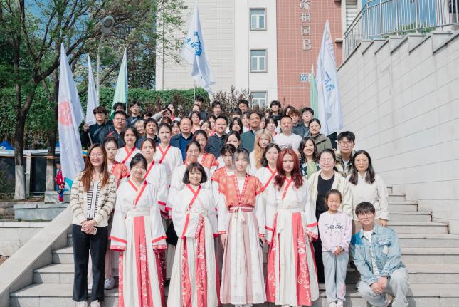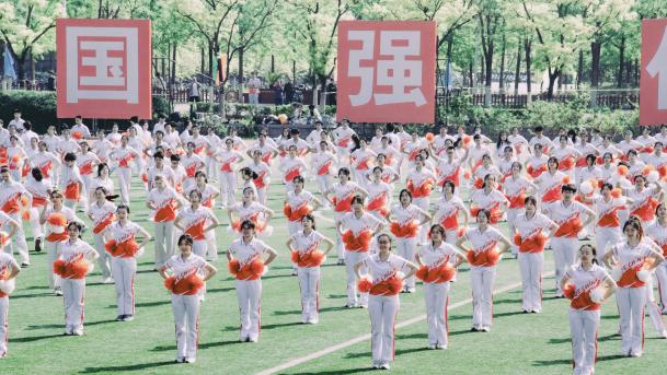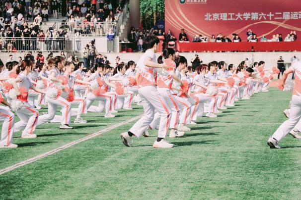 集体跳绳,十人纵身跃起的瞬间,绳影与心跳共振,绊倒时伸来的手比计数更暖人心。滚雪球,十道身影首尾相衔,像烽火在跑道燃烧蔓延,最后一棒急促的喘息里藏着团队的誓言。六人七足,绑带勒紧的不只是脚步,更是六人一体的契合无间,跌撞前行的身影写就共生共荣的热血诗篇。看台助威,嘶吼着"明德必胜"的声浪席卷看台,连春风都成了啦啦队的和声。方阵表演中,旗手扬旗似烽火传讯,展板翻转拼出"明德惟馨,全场惊呼与快门声交织,正是对"六艺"今释最炽热的礼赞。